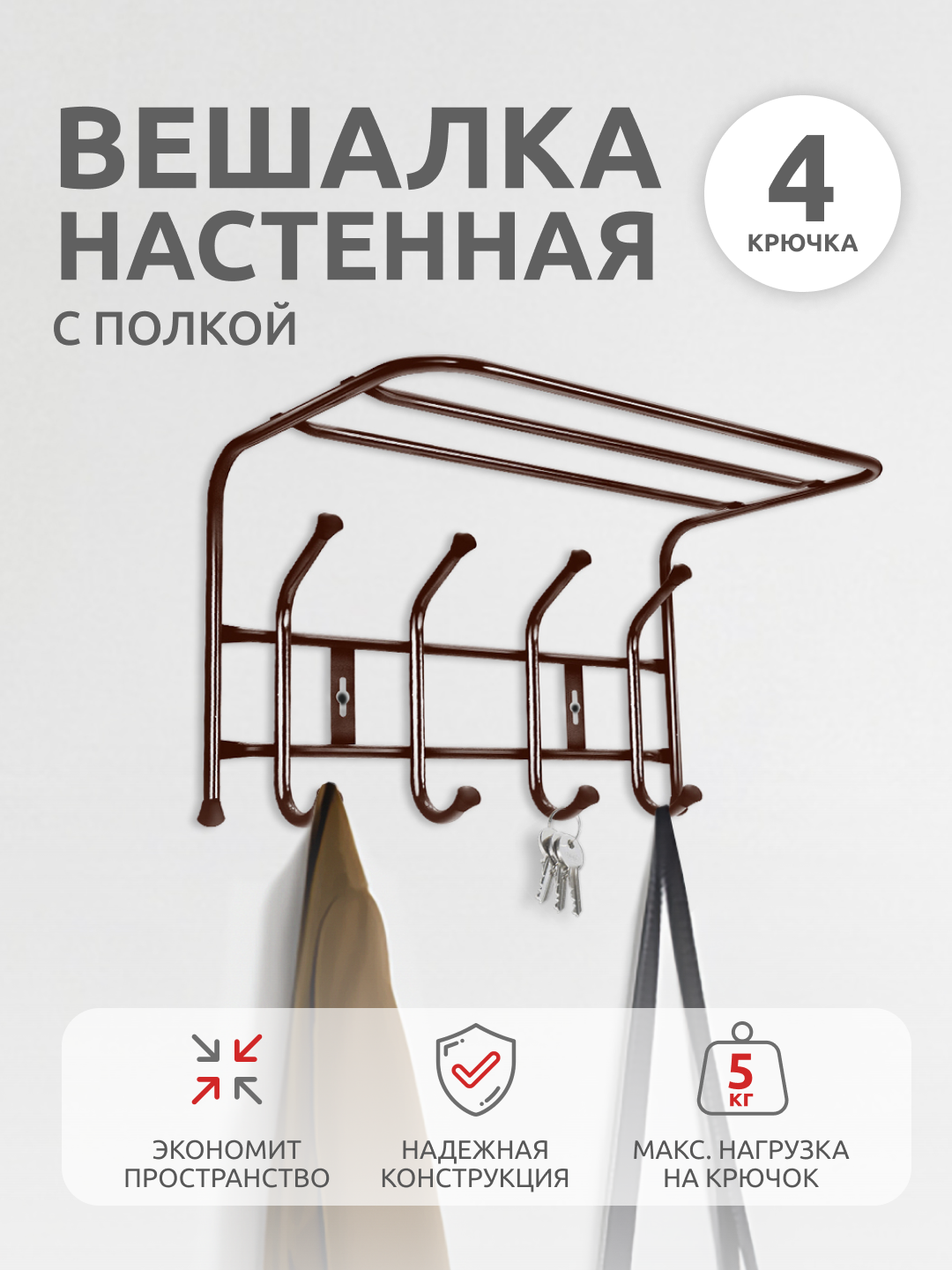 Вешалка с полкой настенная металлическая на 4 крючка ВП4 белый