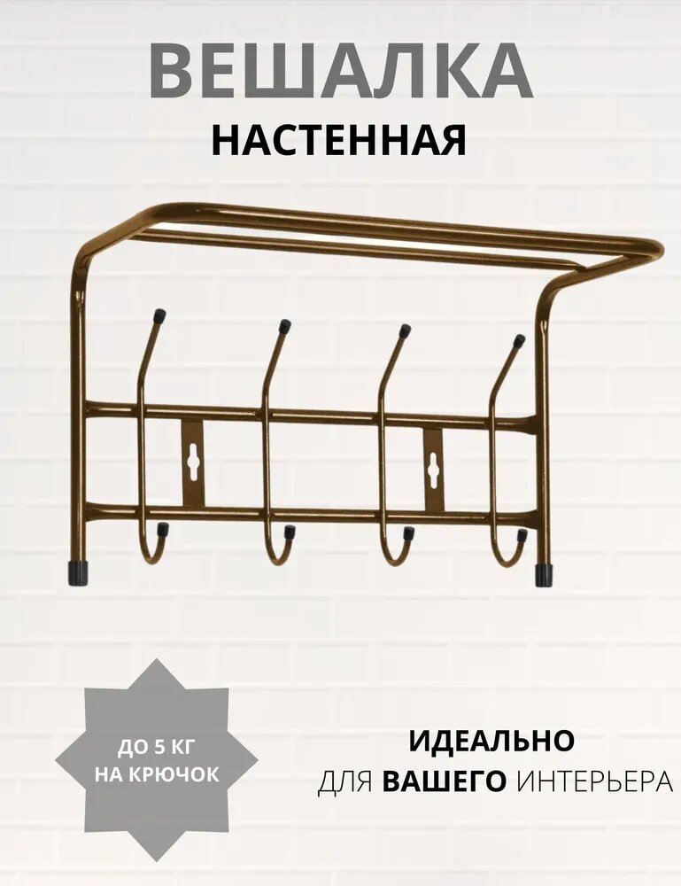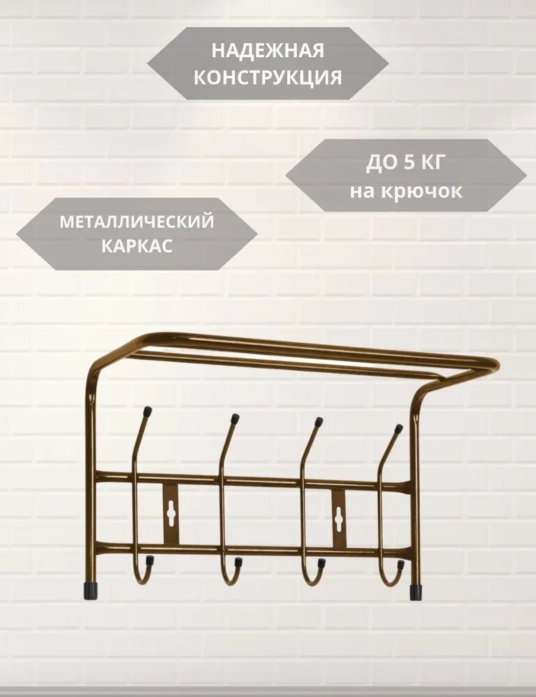 Вешалка с полкой настенная металлическая на 4 крючка ВП4 золотой
