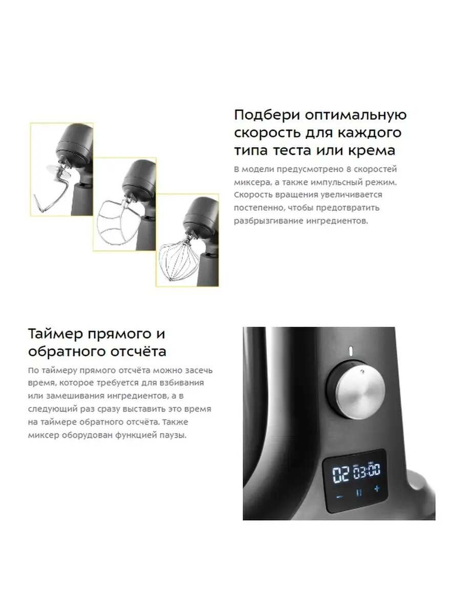 Цельнометаллический корпус Мощность 1200 Вт Таймер Венчик достает до дна Крышка от разбрызгивания Ручка на чаше Три насадки Лопатка Сепаратор яиц |