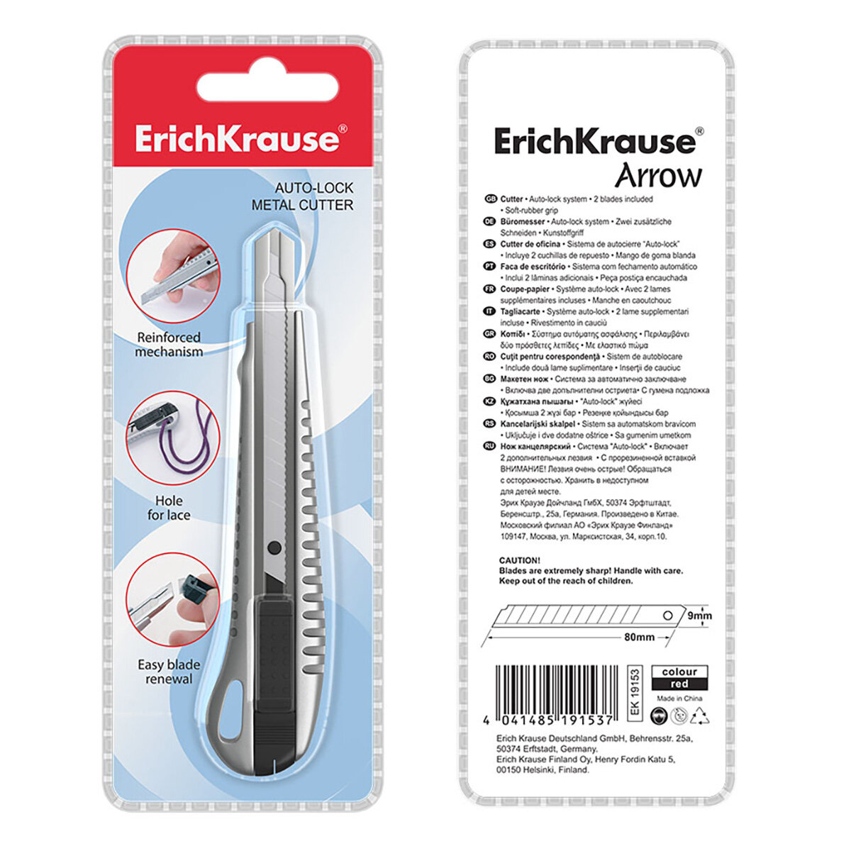 Нож канцелярский Erich Krause с автоматической фиксацией лезвия, металлический, 9 мм (19157)