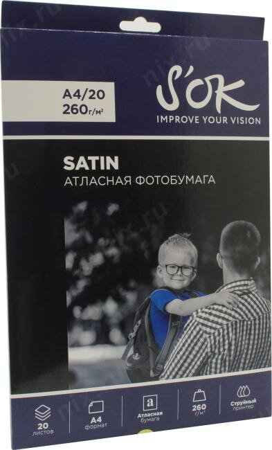Фотобумага S’ok Premium S'OK атласная (сатин), формат А4, плотность 260г/м2, 20 листов