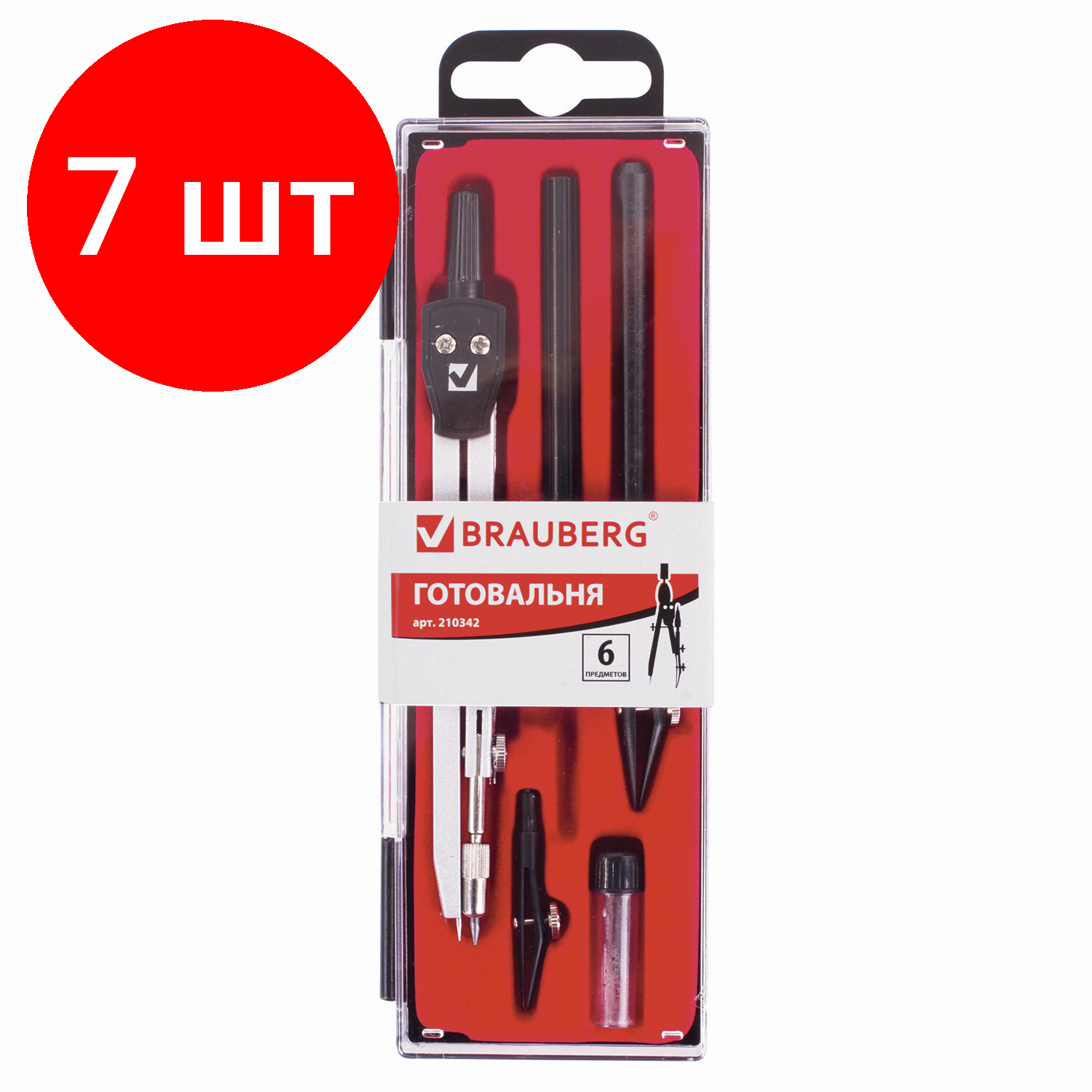 Купить Комплект 7 шт, Готовальня BRAUBERG "Architect", 6 предметов: циркуль, рейсфедер + вставка + держатель, игольная вставка, грифель, 210342