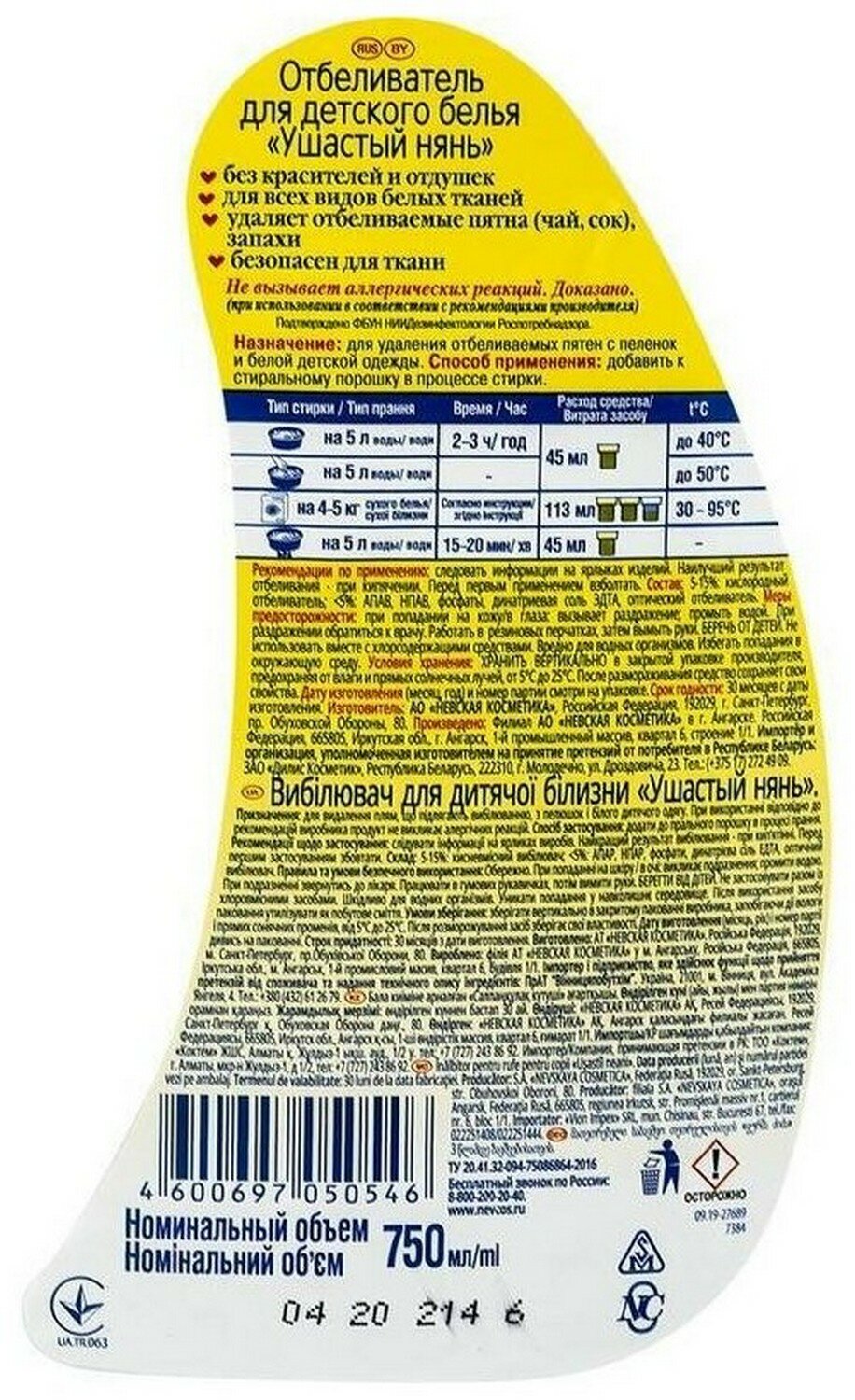 Отбеливатель Ушастый Нянь для детского белья, гель, 750 мл