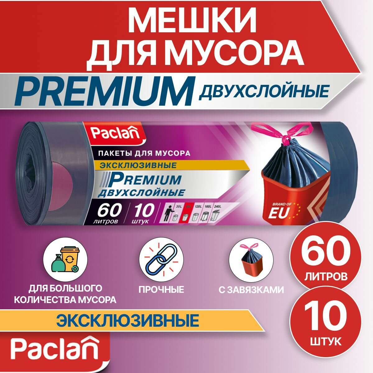 Пакеты для мусора Paclan "Premium", с завязками, 60 л, 10 шт - SEDO HOUSEHOLD products