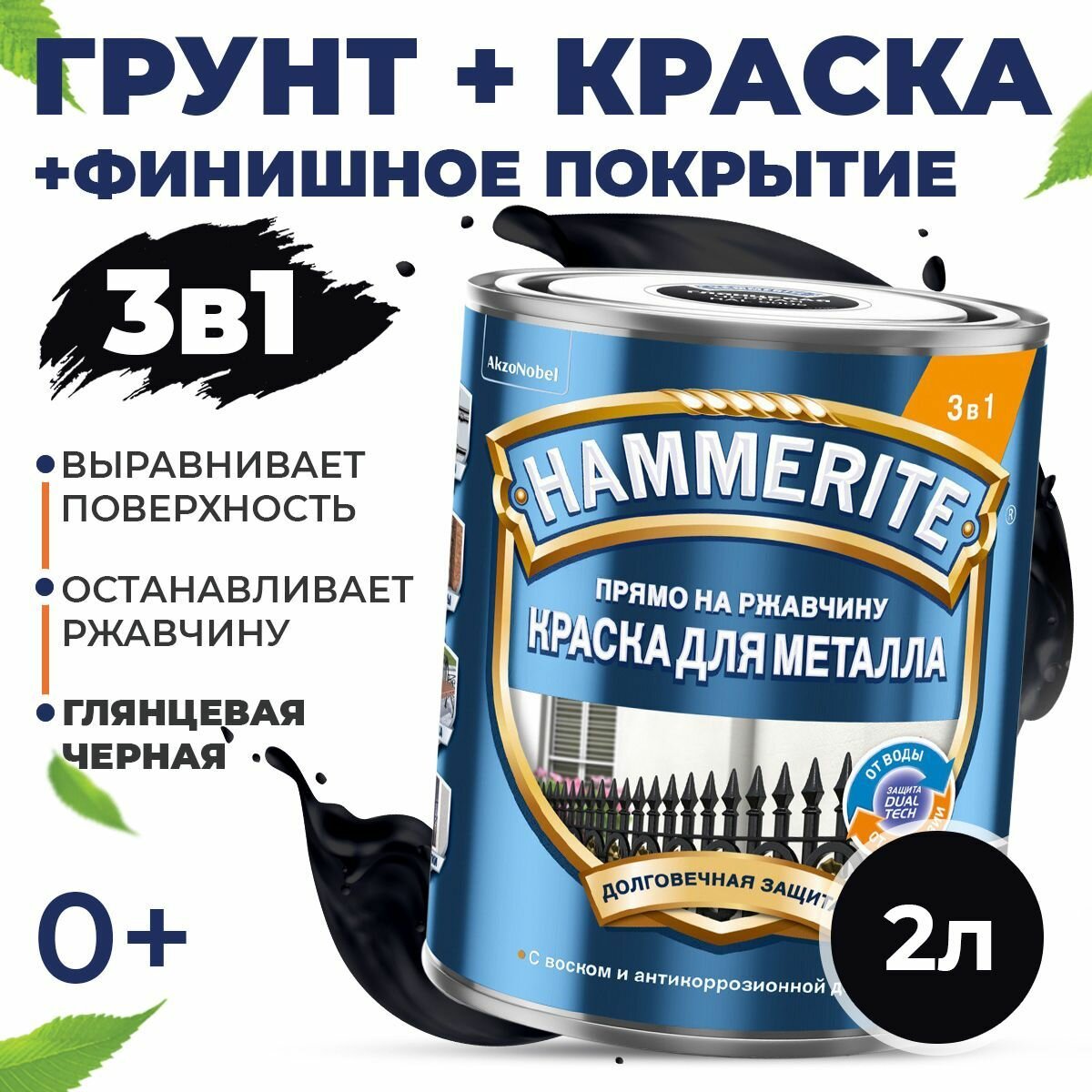 Краска для металла 3 в 1 прямо на ржавчину Hammerite гладкая глянцевая (2л) черный RAL 9005