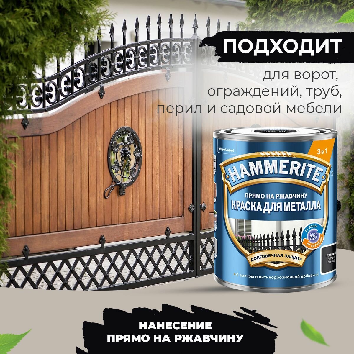 Краска для металла 3 в 1 прямо на ржавчину Hammerite гладкая глянцевая (0,75л) черный RAL 9005