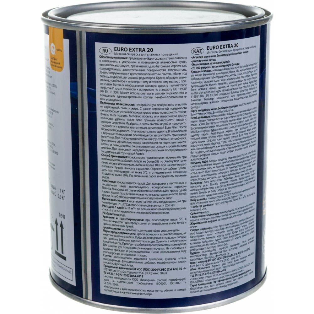 Краска TIKKURILA EURO EXTRA 20 моющаяся для влажных помещений, полуматовая база С 9л бесцветная