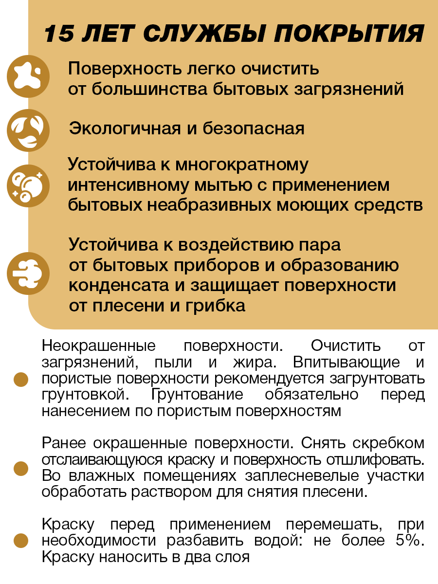 | Плюсы: | Хорошо ложится. Отличная укрывистость. Подходит для влажных помещений. |