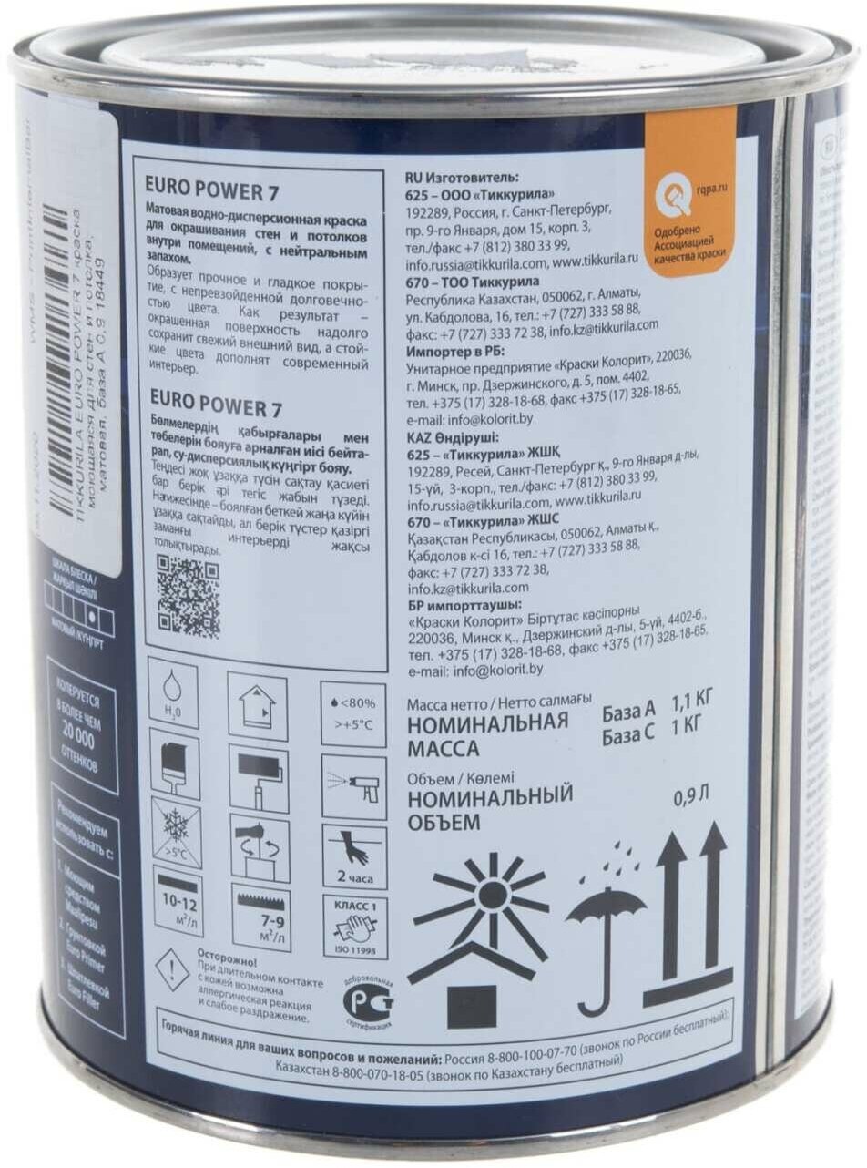 Краска TIKKURILA EURO POWER 7 моющаяся для стен и потолка, матовая, база A 0,9л 700001118