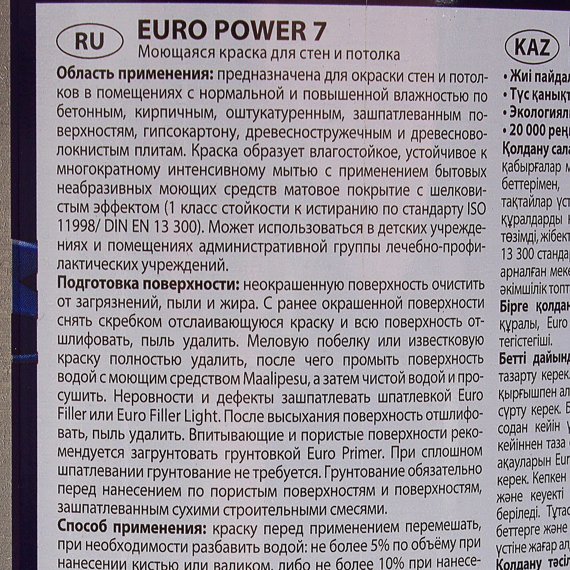 Краска моющаяся для стен и потолков EURO POWER-7 2,7 Л