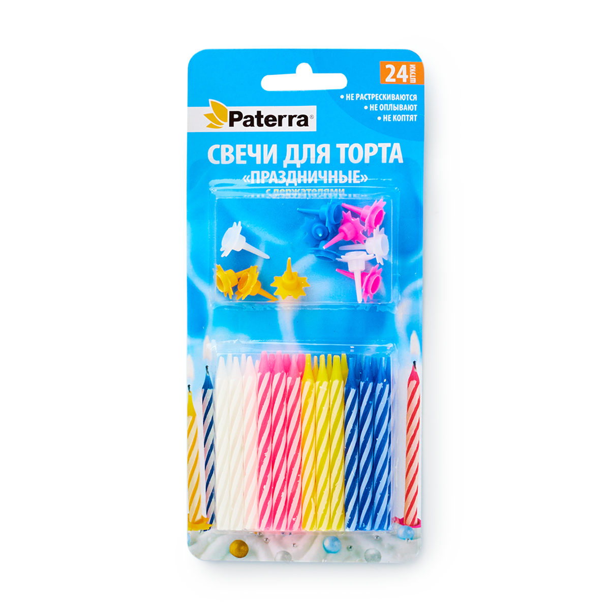 Paterra Свечи для торта Праздничные с держателями, 24 шт., голубой/желтый/розовый/белый