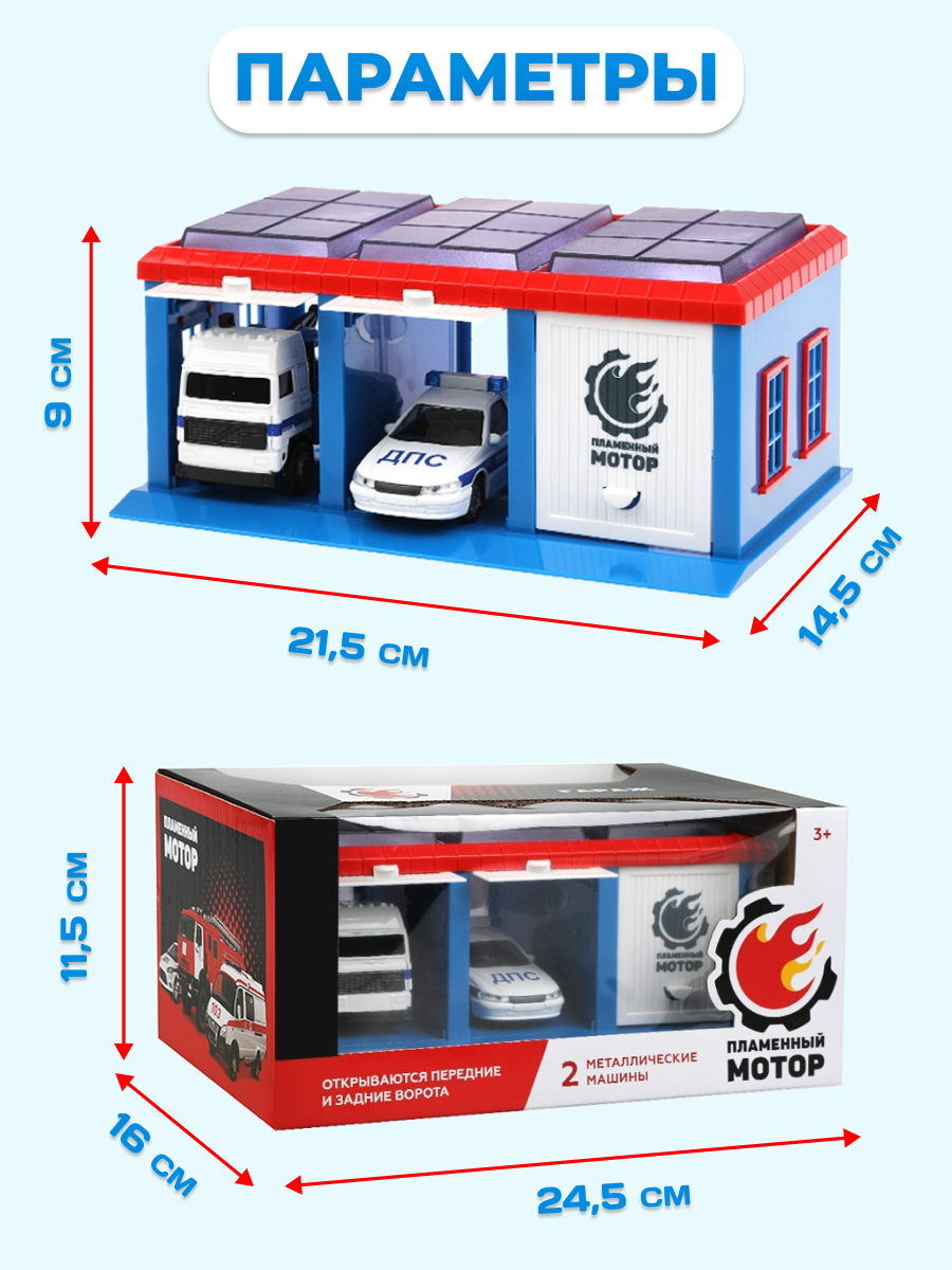 Купить Гараж Полиция ДПС, открываются передние и задние ворота, эвакуатор 1:43, патрульная машина 1:43 Пламенный мотор 870273
