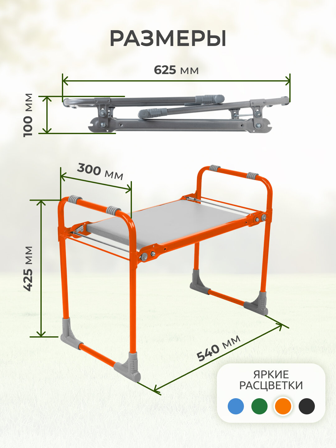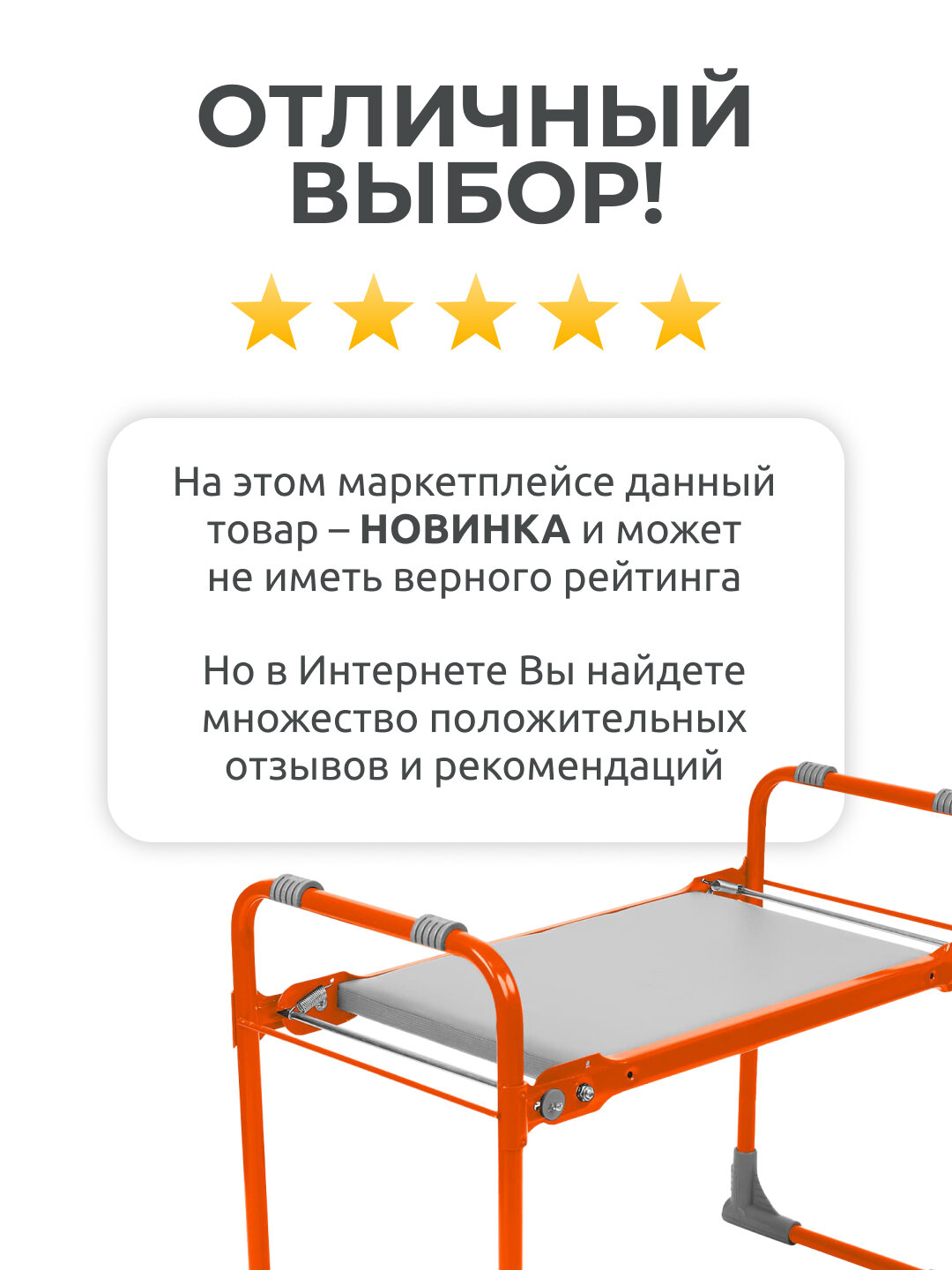 Скамейка оранжевого цвета хорошо заметна на участке. Прочная, лёгкая , удобная для переноски , имеются рукояти, за которые удобно ее держать. быстро складывается и раскладывается. Использую скамейку для множества целей. Можно сидя пропалывать грядки , а если перевернуть, то стоя на коленях. Использую как подставку , на которую можно встать и собирать вишни, сливы, яблоки, груши и т д . В яркий солнечный день , перемещаюсь с данной скамейкой как с сумочкой , по всему саду и ищу тень . Сбоку имеются поручни, на которые можно повесить различные инструменты, которые нужны для работы в саду, например , секатор, нож, и тд .В разобранном виде занимает совсем мало места. Не боится влаги, если оставите ее на улице. Советую приобретать такую скамейку , вы не пожалеете. Я очень довольна. Использовала все лето и осень. Оценка 5 |