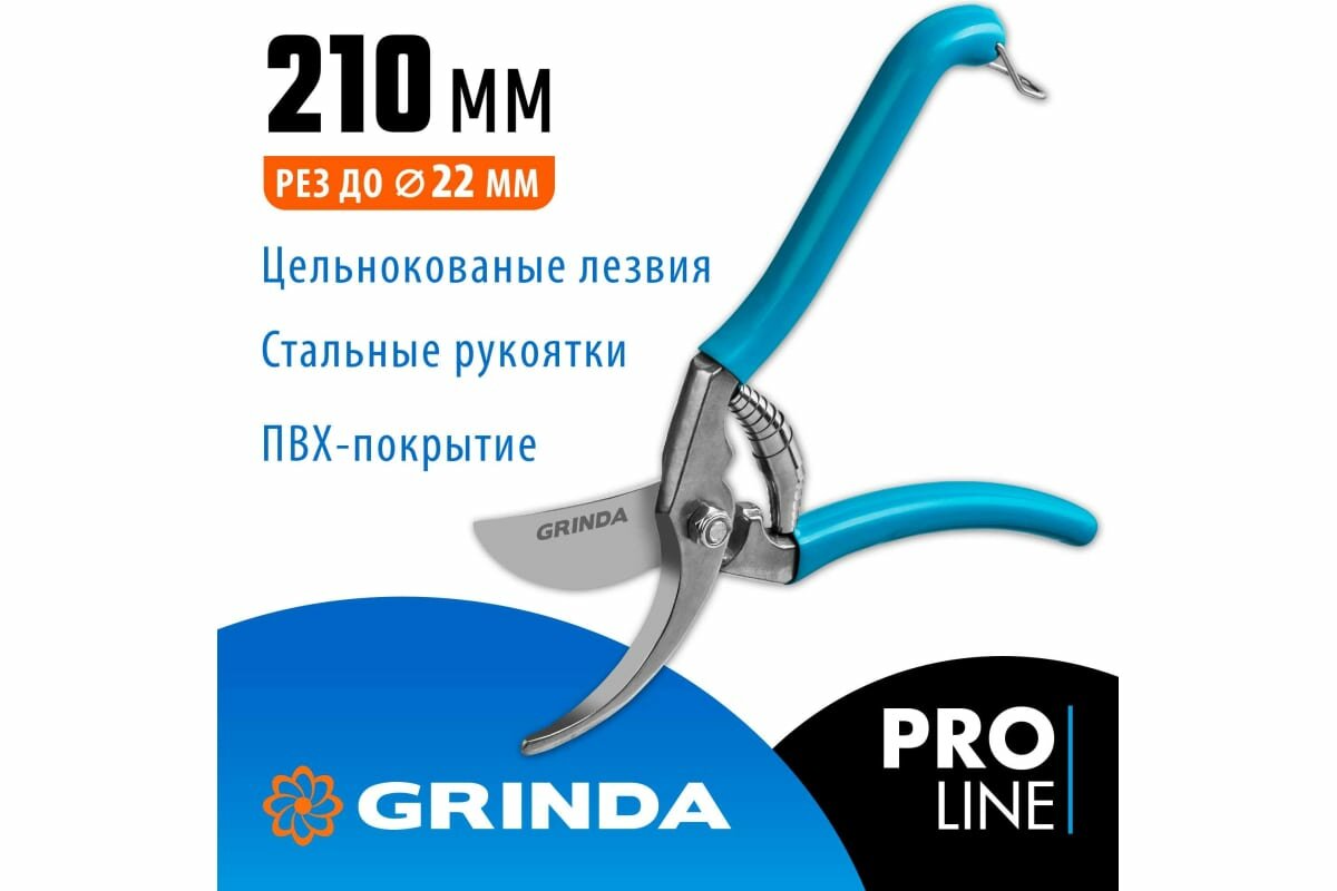 GRINDA P-10, 210 мм, цельнокованные лезвия, стальные рукоятки, покрытие ПВХ, плоскостной секатор, PROLine (423410)