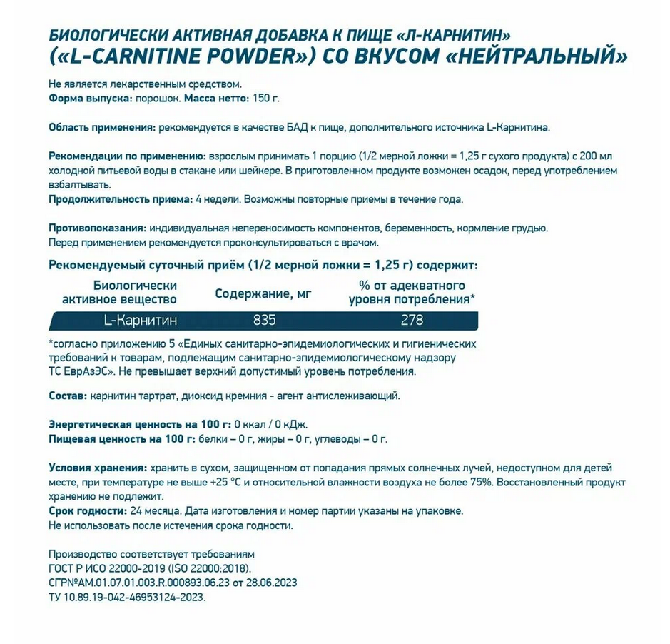 Жиросжигатель CARNITINE 150 g Без вкуса