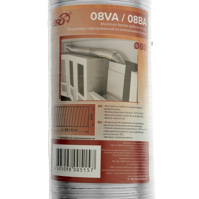 Эра Воздуховод гибкий алюминиевый гофрированный Era 08ВА, D 80, 3 м