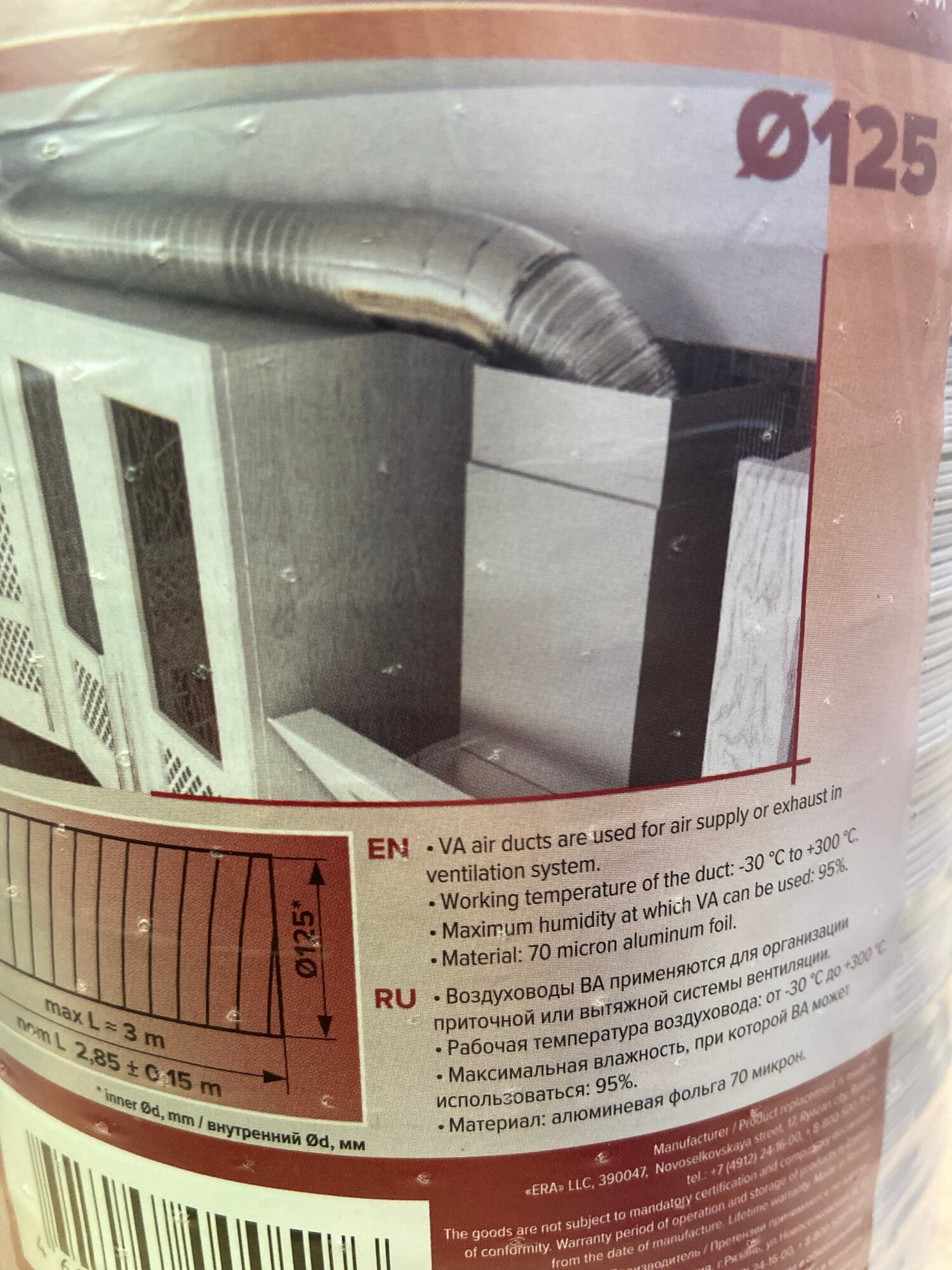 Круглый гибкий воздуховод ERA 12,5ВА 3000 мм 125 мм