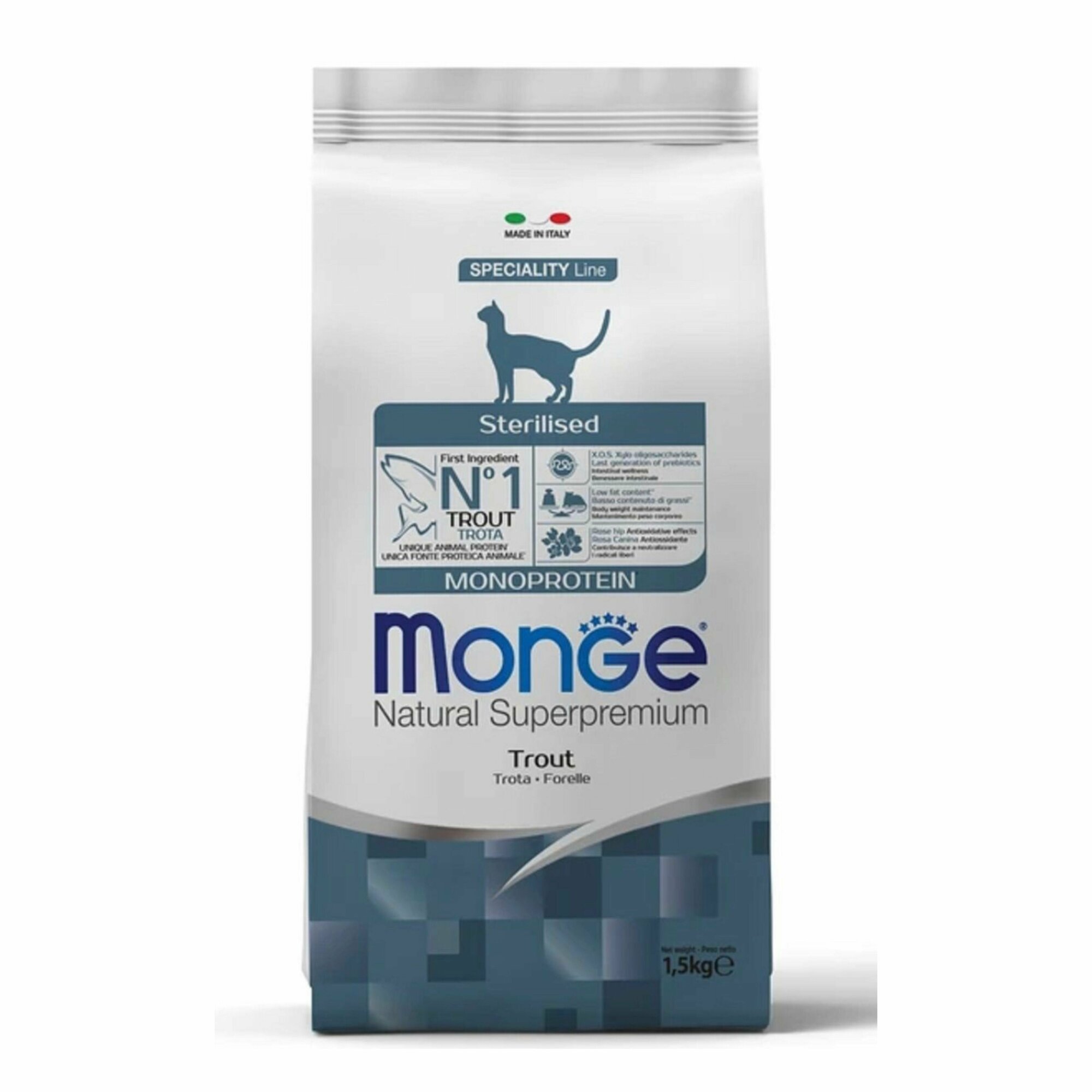Сухой корм Monge Cat Monoprotein Sterilised Trout для стерилизованных кошек, с форелью, 1,5 кг