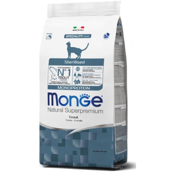 Купить Сухой корм для стерилизованных кошек Monge Natural Superpremium Monoprotein Sterilised Trout, с форелью, 10 кг