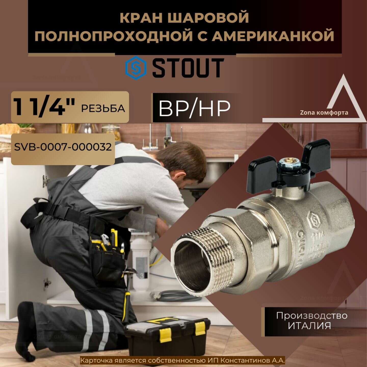 Кран шаровой полнопроходной с американкой, ВР/НР, ручка бабочка 1 1/4, STOUT SVB-0007-000032