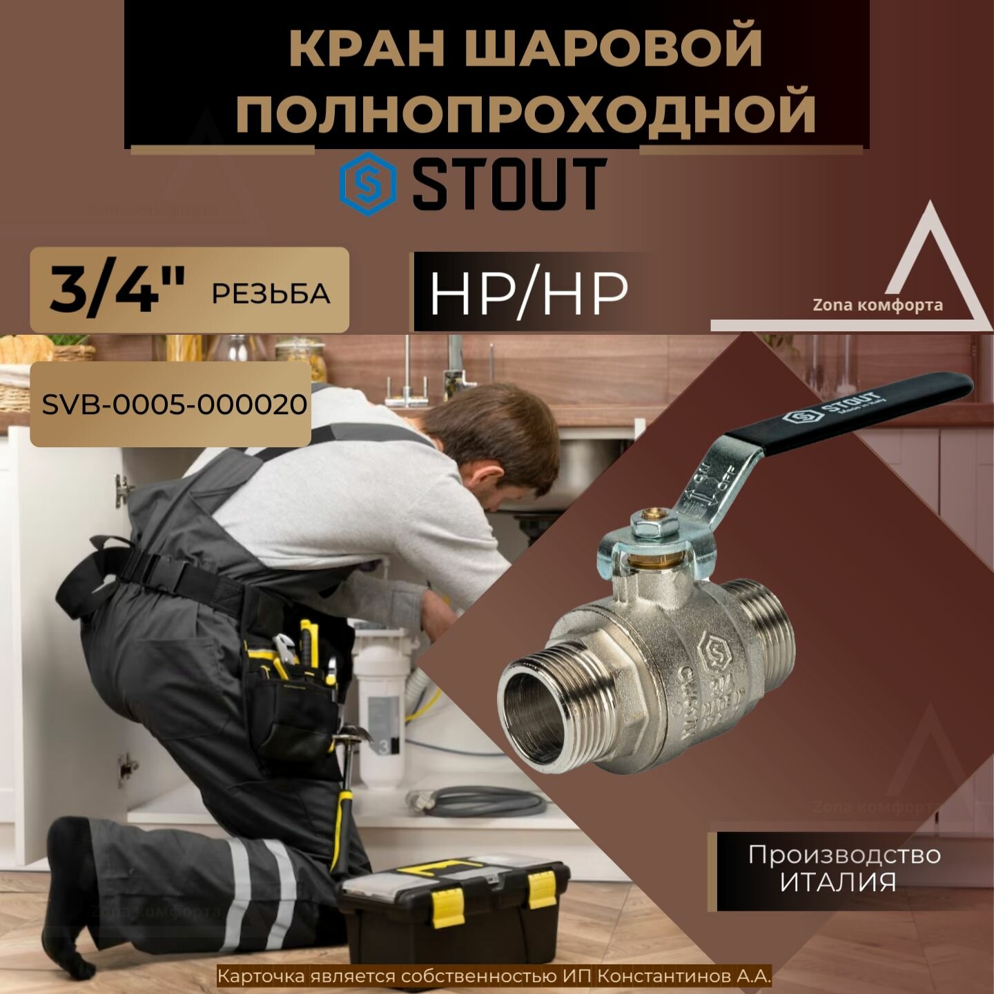 Кран шаровый STOUT SVB-0005 муфтовый (НР/НР), латунь для бытовой техники Ду 20 (3/4")