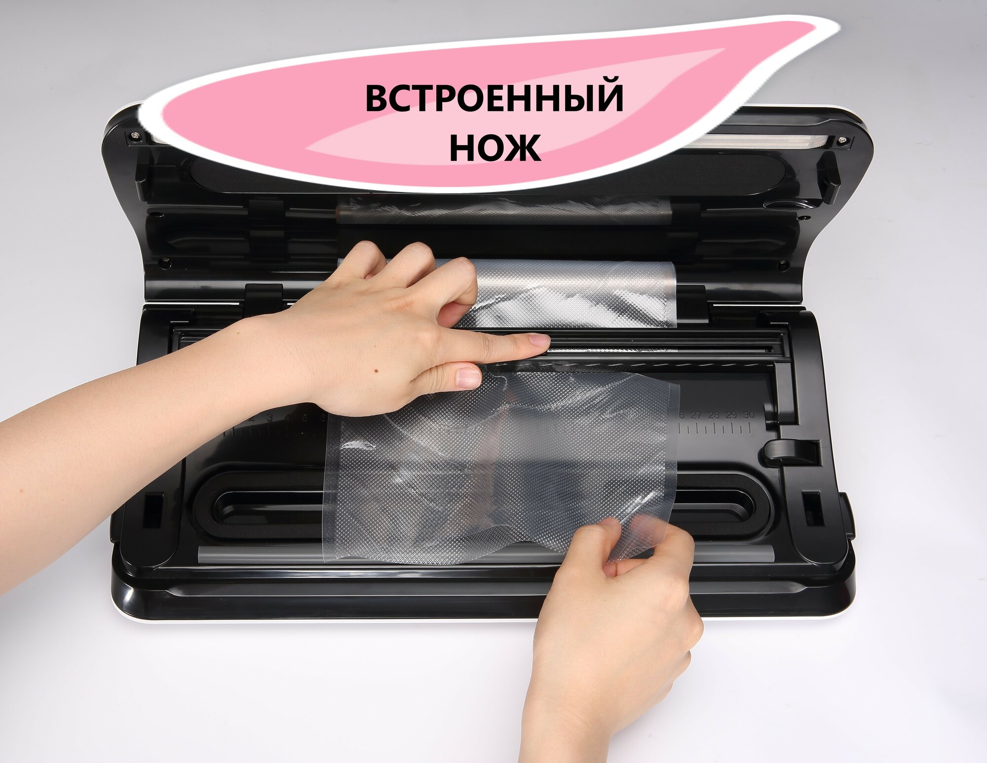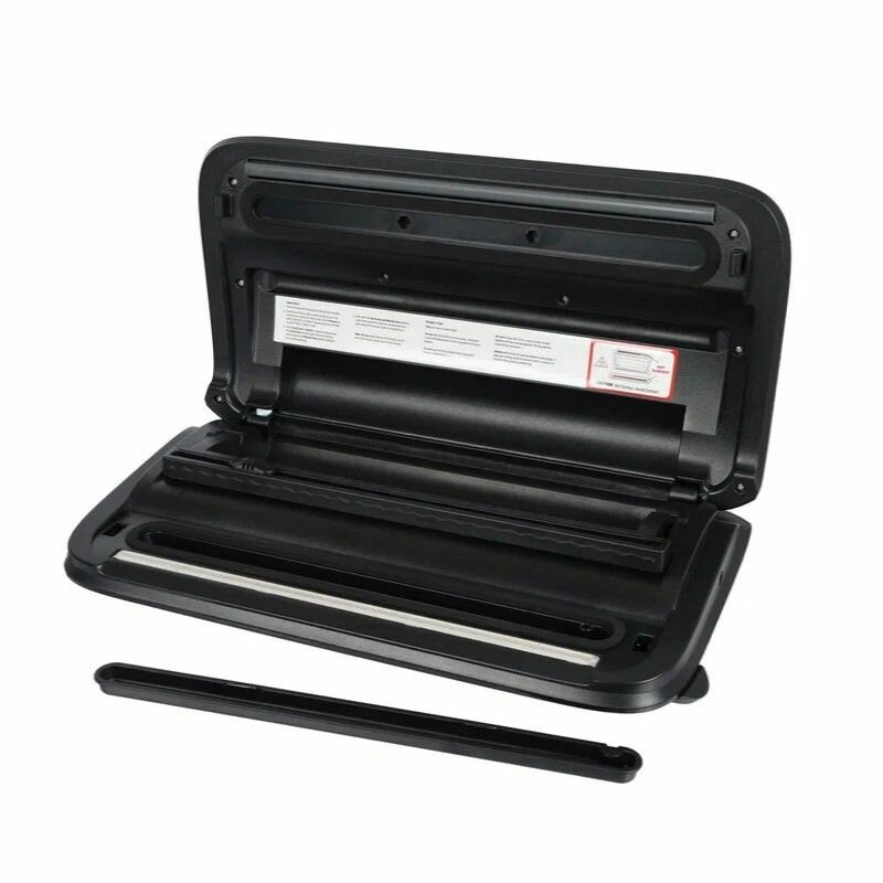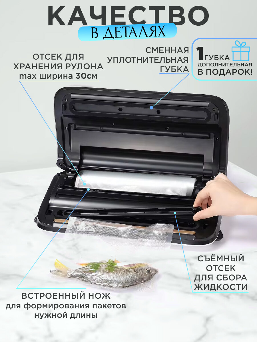 - Мощный, - удобный отсек для хранения рулона с пленкой, - удобный "отрезатор" пленки, - простое и удобное управление (язык не имеет значение), - есть поддончик для удобного слива жидкости, случайно всосавшейся при упаковке пакета, который легко снимается и моется! |