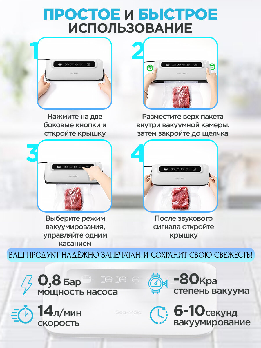 | Отзыв: | Пересмотрела кучу обзоров и отзывов прежде, чем самой купить вакууматор. Хотелось, чтоб был и надежный, и мощный, и с разными режимами. Брала, естественно в интернете, так как в наших магазинах цены, обычно, раза в полтора-два выше. Очень понравился упаковщик Sea-maid GN 1108 Black edition. Он выглядит очень красиво, такой стильный, черный, с сенсорными кнопочками-загляденье. К тому же по характеристикам присутствовало все, что я хотела и даже больше. Им можно вакумировать влажные и сухие продукты, мягкие продукты, зеленушку и прочее. Можно даже контейнеры вакуумировать, там еще специальный шланг в комплекте идет. так же по стандарту место для пленки и резак для формирования пакетов той длины, который мне будет нужен. Ширина запайки 4 мм, это очень удобно, открывается потом пакет очень легко, даже нож использовать не нужно. резервуар для жидкости тоже имеется. начинала с малого, чтоб научится, а потом понесло. И маринады, и запекания, и другие различные виды приготовления.Очень круто, столько полезностей. На зиму вообще выручает, можно что угодно заморозить, а потом зимой достать и кушать. Тем более, свое домашнее вакуумируем, а не покупное с кучей химикатов. Если пакеты закончились, то купить не проблема, во многих магазинах продают. Единственный минус, это то, что буквы на аппарате на английском языке, не сразу разобрались. Но сейчас уже все на автомате, знаю где какой режим и прочие мелочи. |
