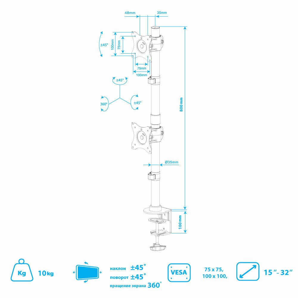 | Плюсы: | Надёжное крепкое крепление. Использовал под один монитор, нужно было поднять высоко над столом. |