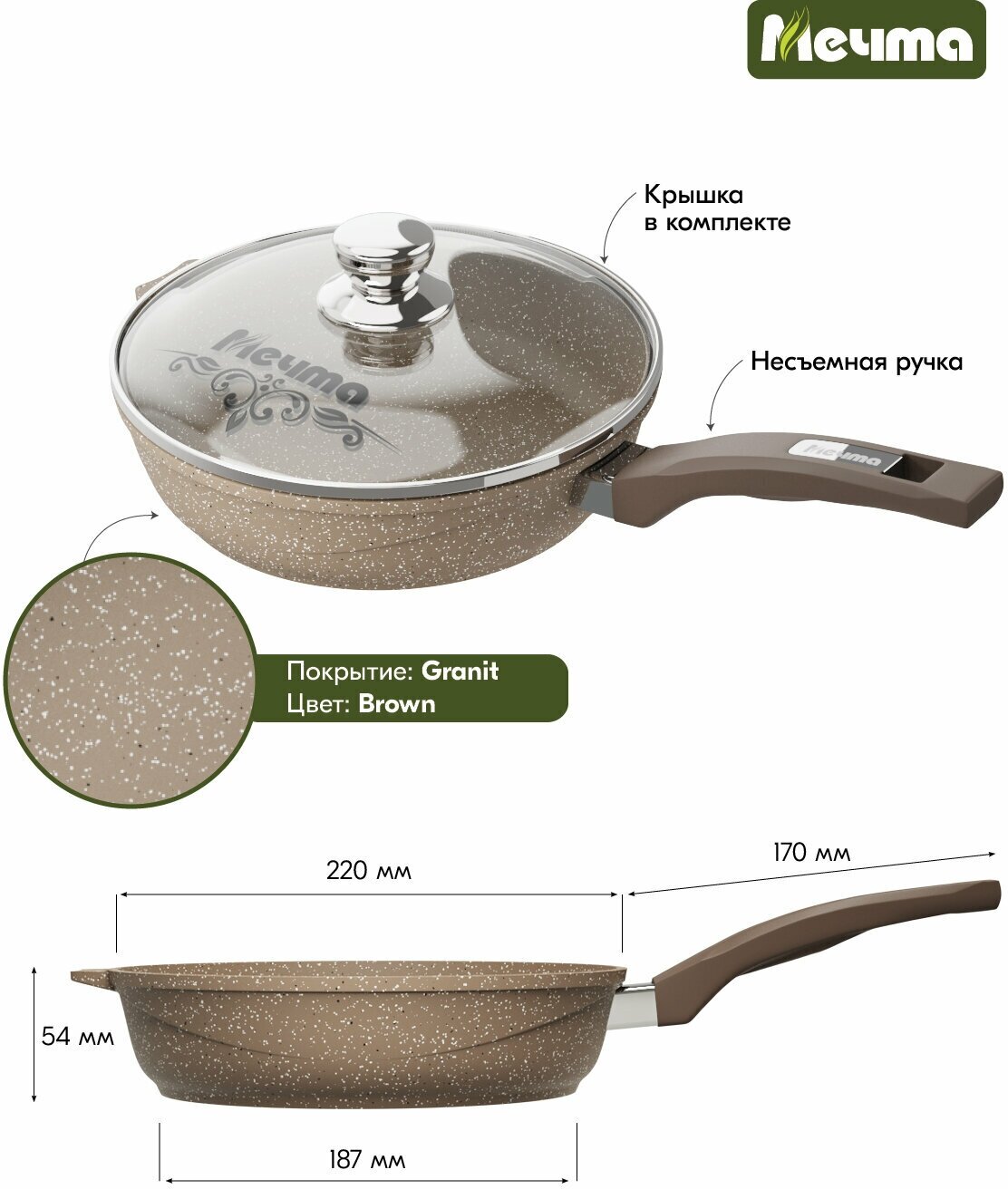 СохранитьСковорода Мечта 22см Гранит с антипригарным покрытием с несъемной ручкой и крышкой с22806 интересное: