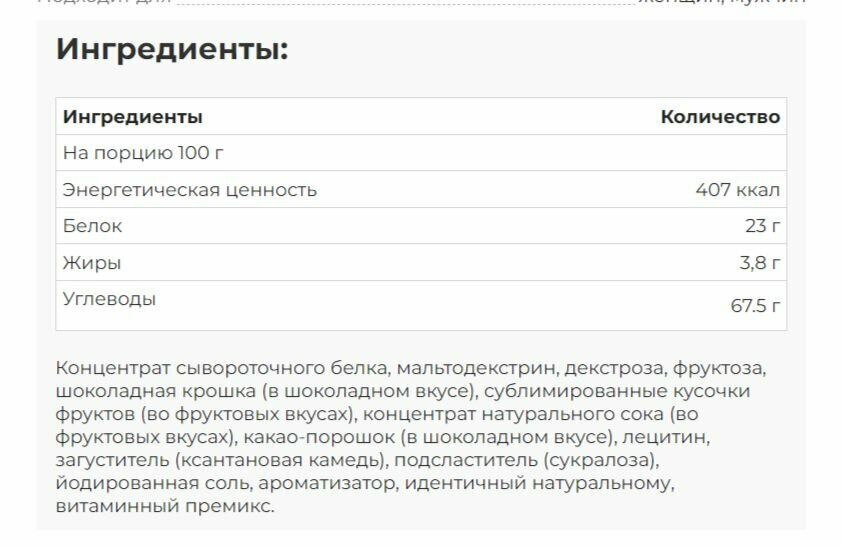 | Отзыв: | Рабочий продукт, при интенсивных нагрузках набирается вес, без отложения жира. В составе гейнера присутствуют кусочки фруктов |