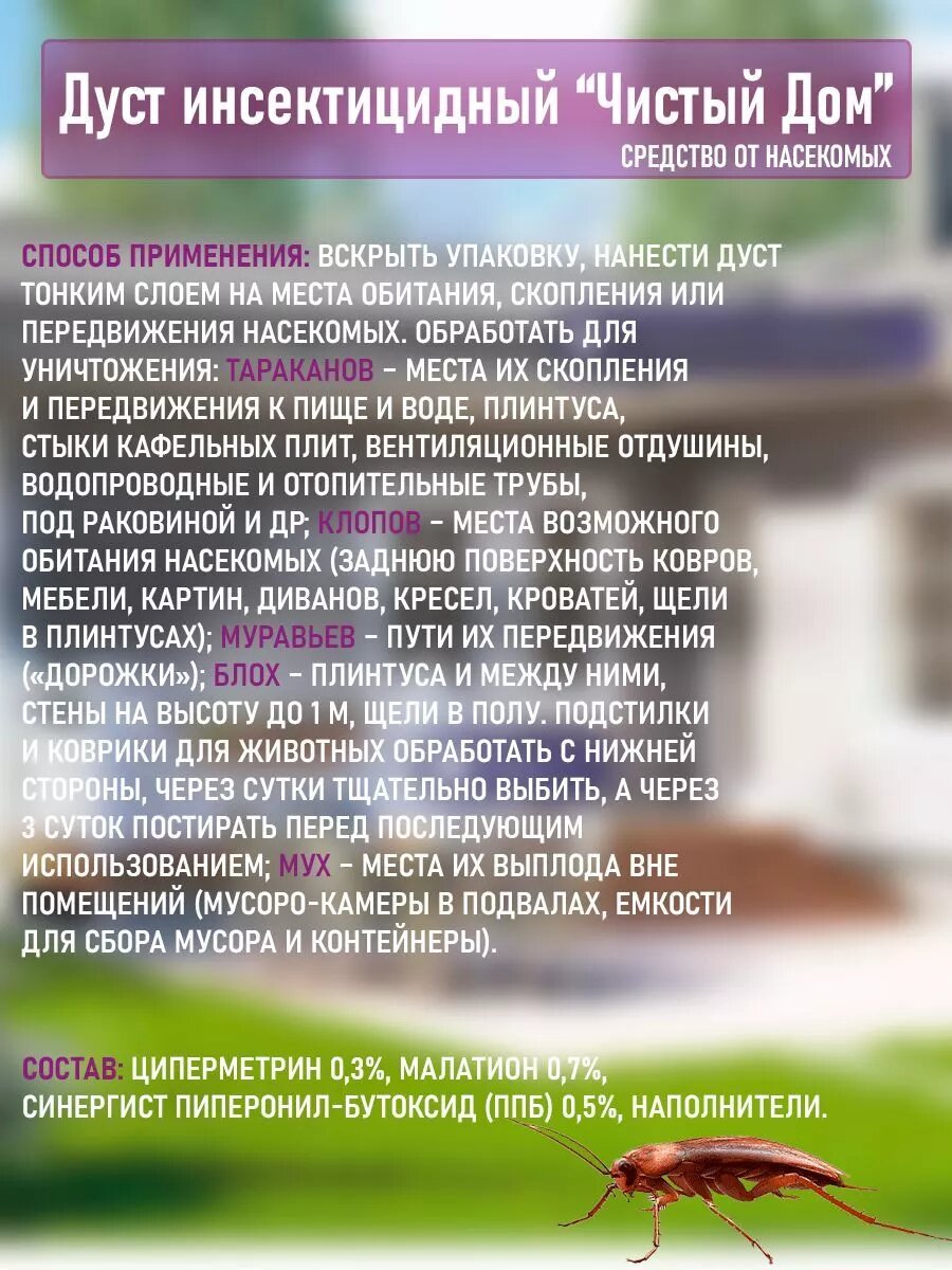 Инсектицидный дуст предназначен для уничтожения тараканов, муравьёв, блох, клопов, мух. Недостатки: Народные средства поэффективней будут. Быстро насекомые привыкают к химии. Обработку помещения проводить в перчатках при открытых окнах в отсутствии людей и животных. |