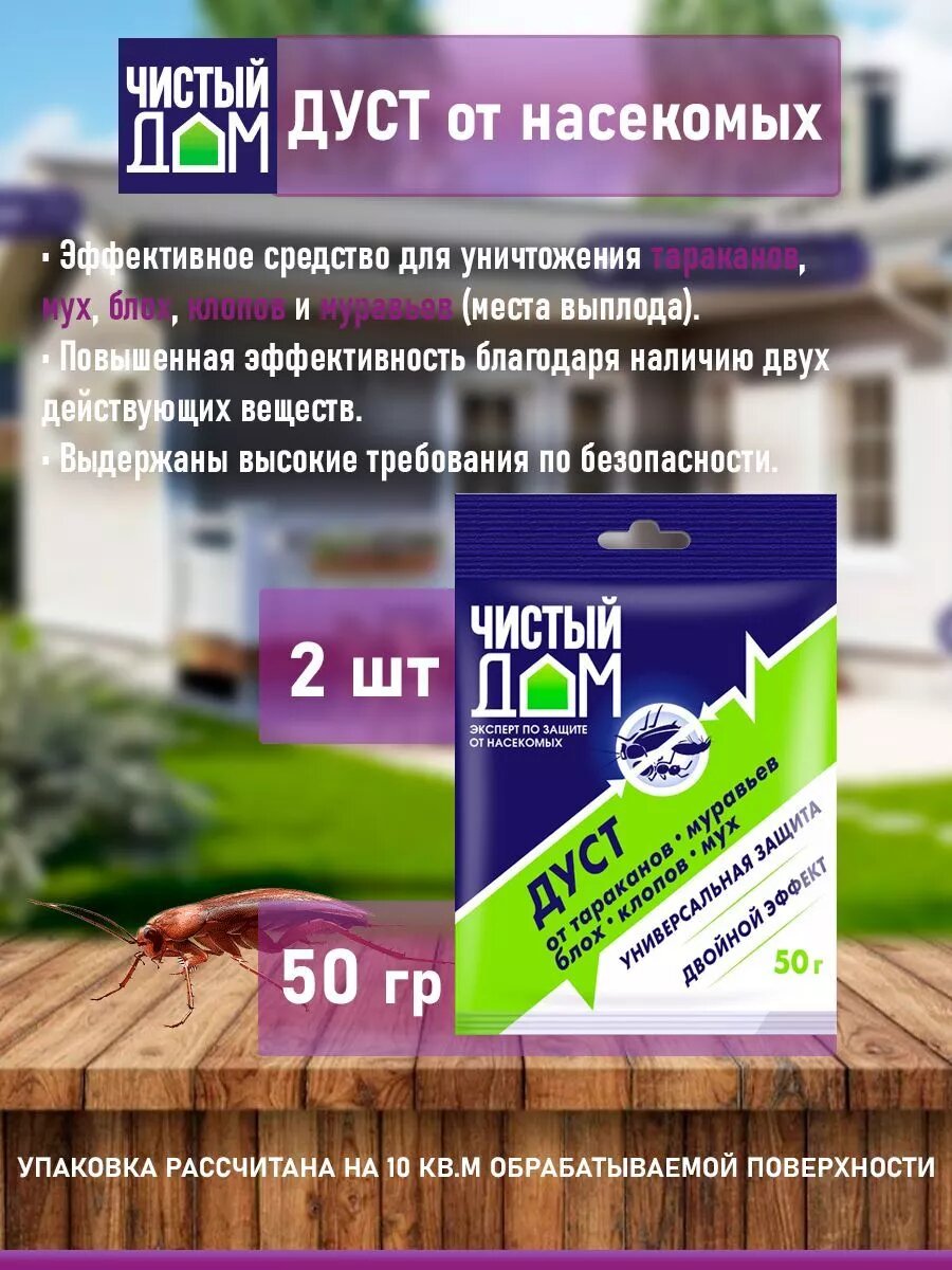 Купить Дуст Чистый Дом отрава от ползающих и летающих насекомых, тараканов, муравьёв, блох, клопов, мух 50 г - 2шт