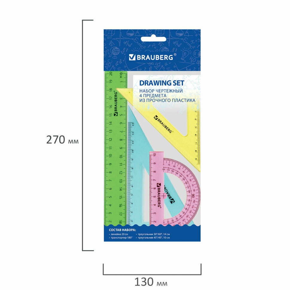 Комплект 4 шт, Набор чертежный средний BRAUBERG "Crystal" (линейка 20 см, 2 угольника, транспортир), цветной, 210296