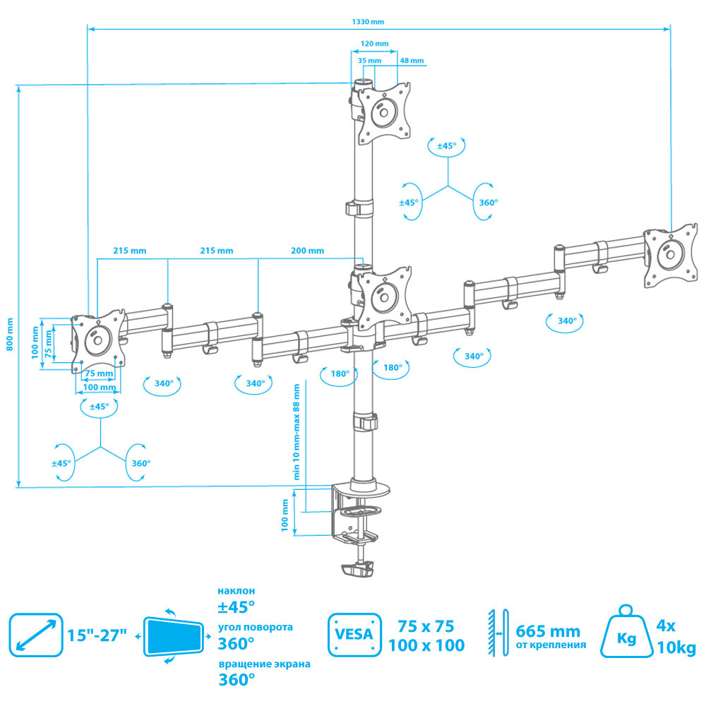 Кронштейн для мониторов Arm Media LCD-T16 Для 4-Х 10"-32", max 4x10 кг, 5 ст свободы, поворот на штанги 360°, высота штанги 450мм, maxVESA10