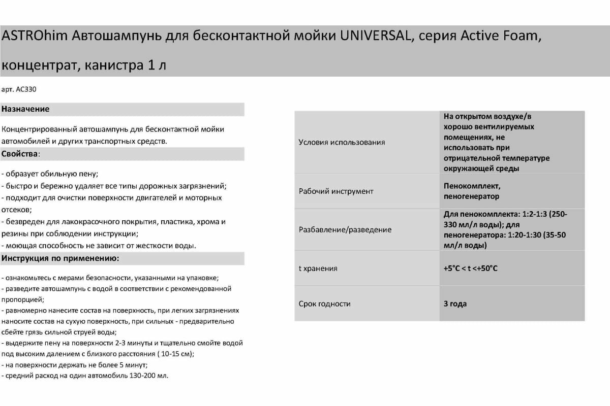 АС-330 Автошампунь для бесконт.мойки "Universal" 1л (пеногенератор 1:20-1:50,пенокомплект 1:3-1:5)