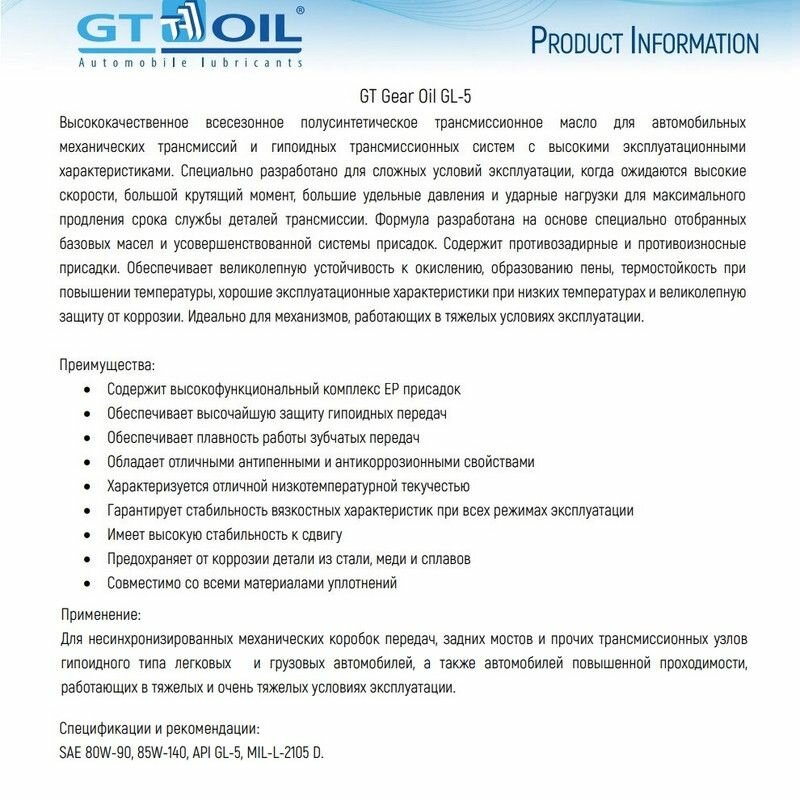 | Производитель | GT OIL |