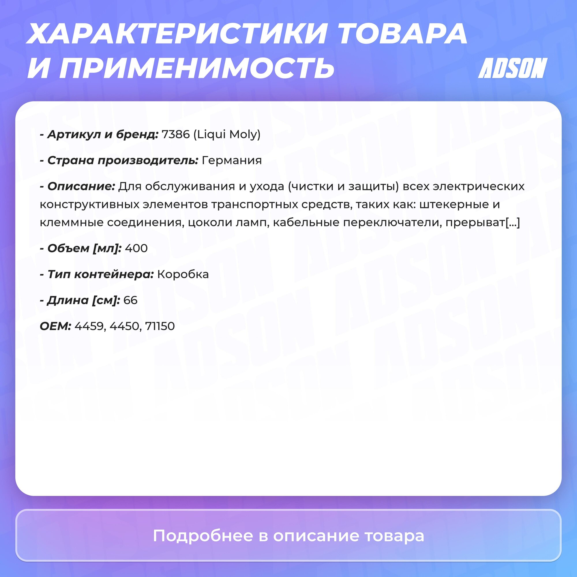 7386_Очиститель Контактов! Электропроводки, Не Повреждает Пластик И Резину, 400Мл Liqui moly арт. 7386