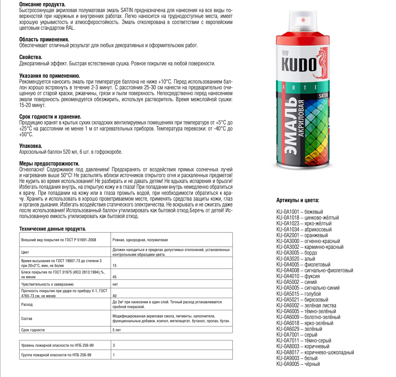 KUDO KU0A3000 Краска красная огненно акриловая satin RAL3000 аэрозоль 520мл KUDO