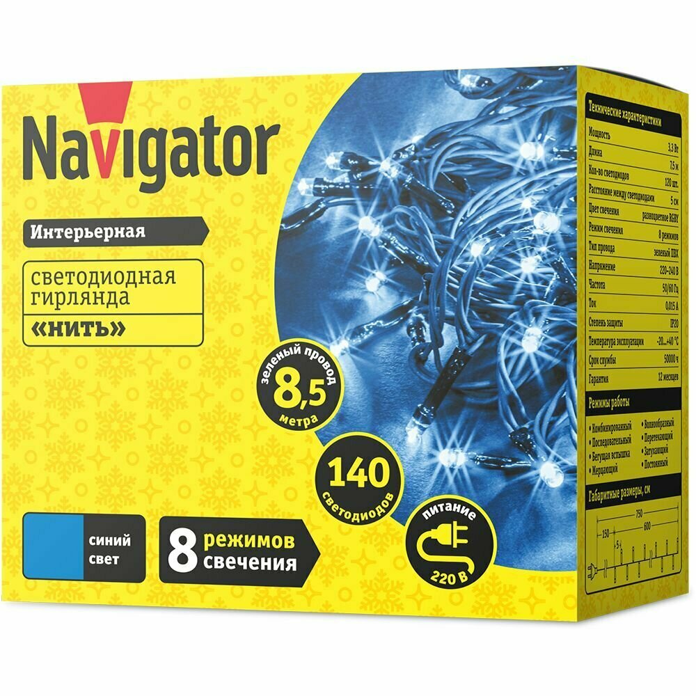 СохранитьГирлянда светодиодная Нить Navigator 61 817, 8.5 м, синий свет, зеленый провод, IP20 интересное: