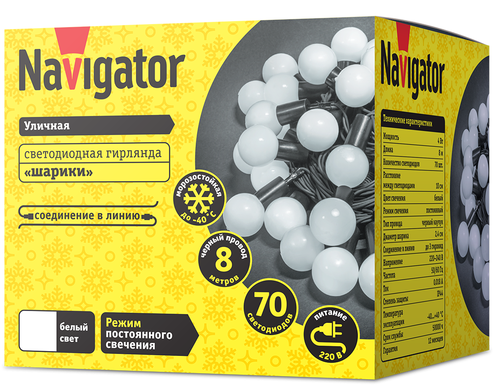 Купить Гирлянда светодиодная Navigator 61 838 Шарики, 8 м, белый свет, IP44