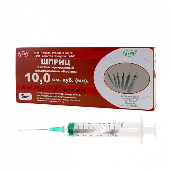 Шприц одноразовый трехкомпонентный SFM 10мл 21G (0.8x40мм, 5 штук в упаковке)