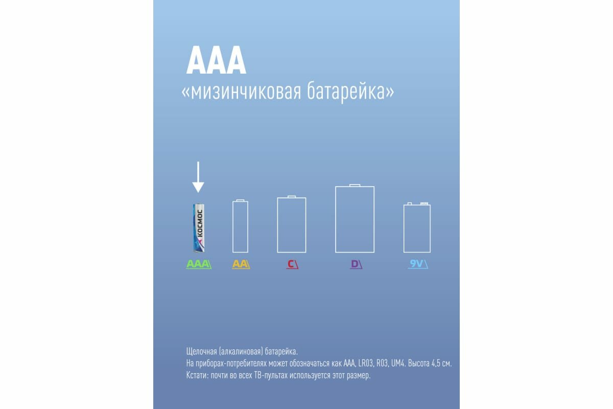 Батарейка космос Alkaline ААА (R03, FR03, LR03, HR03, ZR03), в упаковке 4 шт.