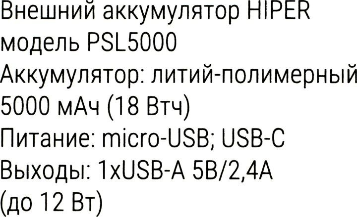 Внешний аккумулятор HIPER PSL5000 Li-Pol 5000 mAh 2.4A 1xUSB 1xType-C черный
