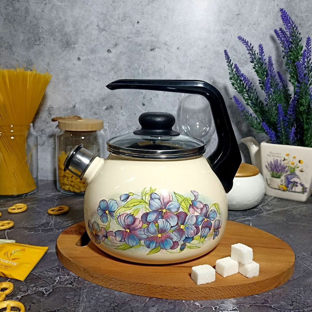 "Фиалка" Чайник эмалированный 2л, д19см, h13см, со свистком, сферическая форма, стеклянная крышка, фиксированная пластмассовая ручка, слоновая кость