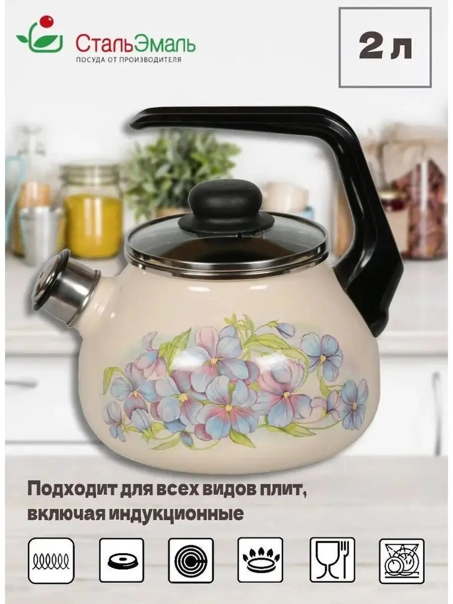СохранитьЧайник СтальЭмаль Фиалка со свистком, из эмалированной стали, светло-бежевый, 2л / кухонная посуда для всех типов плиты интересное: