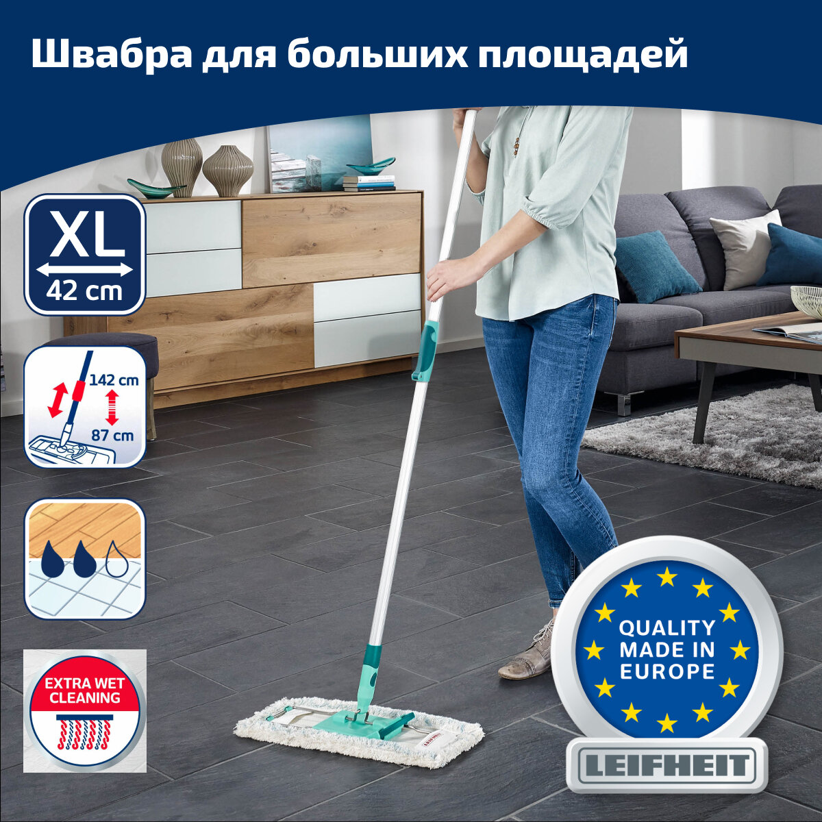 Швабра для пола Leifheit Profi XL micro duo, 42см, с телескопической ручкой 55049