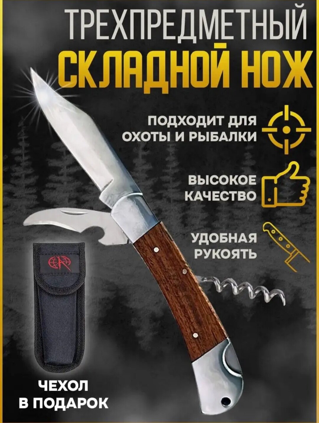 Нож - мультитул складной коричневый для охоты и рыбалки
