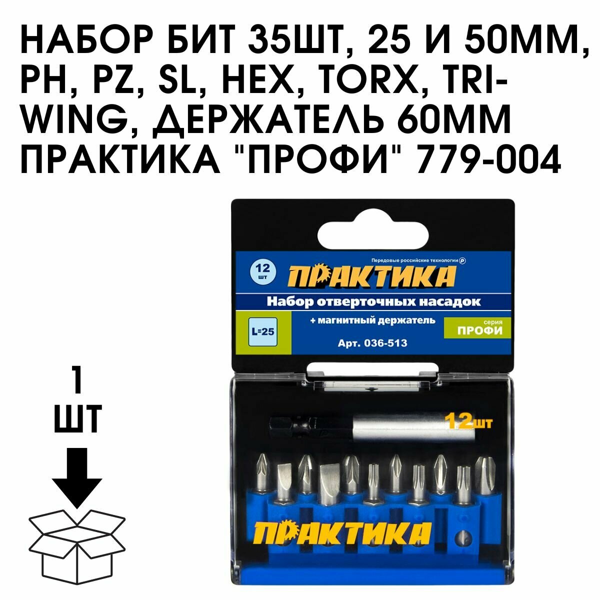 Набор бит ПРАКТИКА "Профи" 35шт, 25 и 50мм, PH, PZ, SL, Hex, Torx, держатель 60 (779-004)