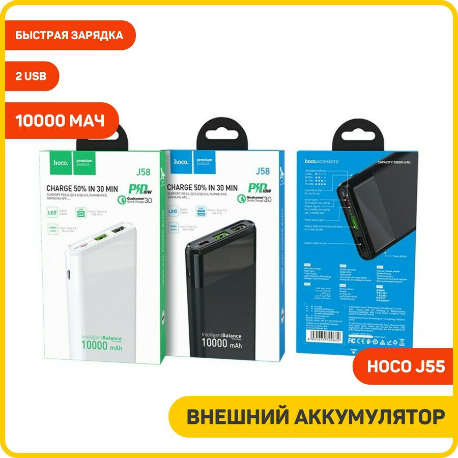 Портативный аккумулятор HOCO J55 Neoteric, 2A, 10000 мА⋅ч, черный