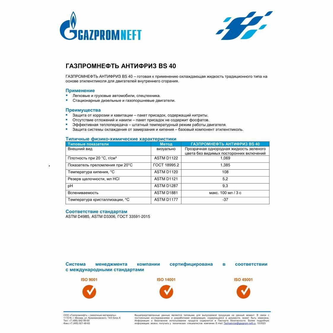 Антифриз BS 40 GAZPROMNEFT готовый (зеленый) 10кг